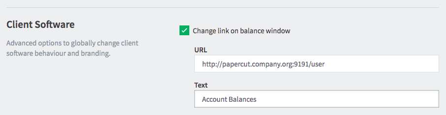 If the user does not have access to charge to their Personal Account, then you will need to customize the link in the User Client to change the URL used in the Account Selection Popup. This can be found under the PaperCut Admin user interface via Options → General → Client Software → Change link on balance window. You can see an example below.