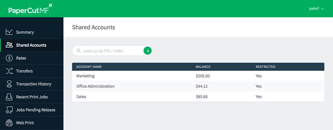 Users then need only click to navigate to the “Shared Accounts” tab of the User web interface in order to see their Shared Account balances. You can further streamline the process by setting the default landing page for users logging into the User web interface. This can be done under Options → General → User Features → Initial page displayed after successful login. Set that to “Shared Accounts”, so that the Shared Accounts page will be displayed immediately after login.