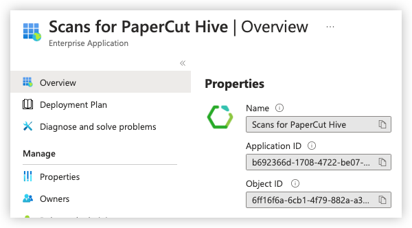 After authorization is successful, go to your Microsoft Azure admin interface and check that either Scans for PaperCut MF or Scans for PaperCut Hive is listed as an enterprise app .