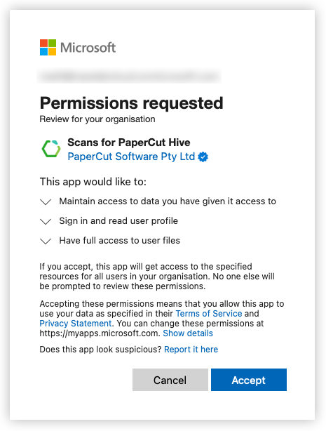 When visiting the URL, you’ll be prompted to authorize either Scans for PaperCut Hive or Scans for PaperCut MF. Here’s an example of the Microsoft screen that’s displayed. This screen will vary based on the product and storage destination you authorize.