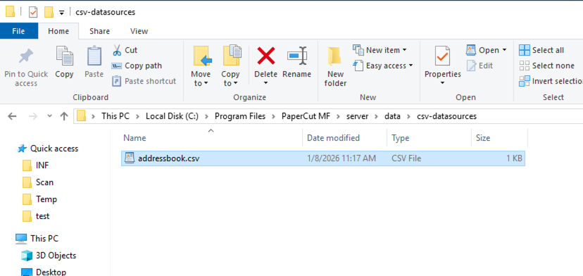 On a 64-bit Windows server running PaperCut MF, this path is C:\Program Files\PaperCut MF\server\data\csv-datasources.